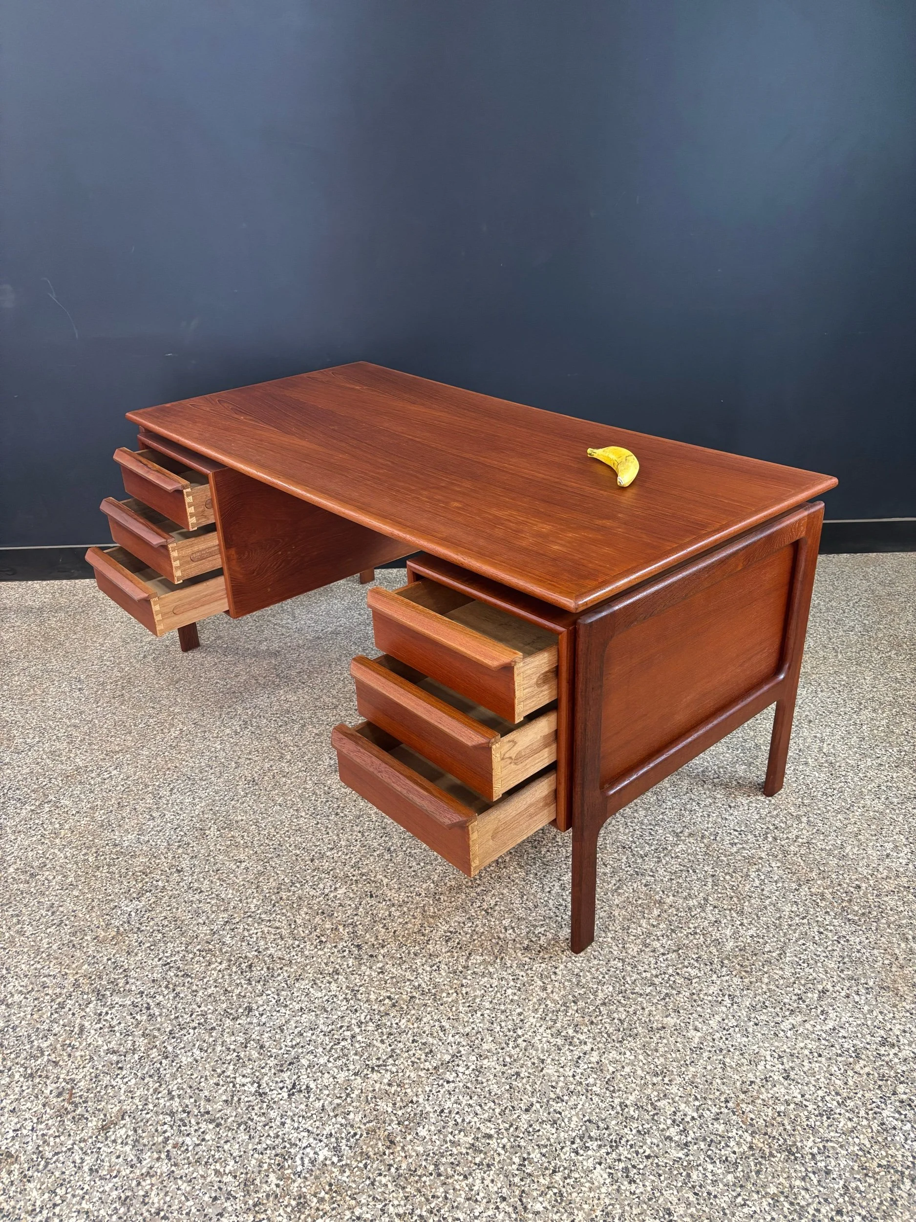 Restored vintage 1970’s Mid Century Danish Modern GV Gasvig for GV Mobler teak six drawer floating top executive desk.