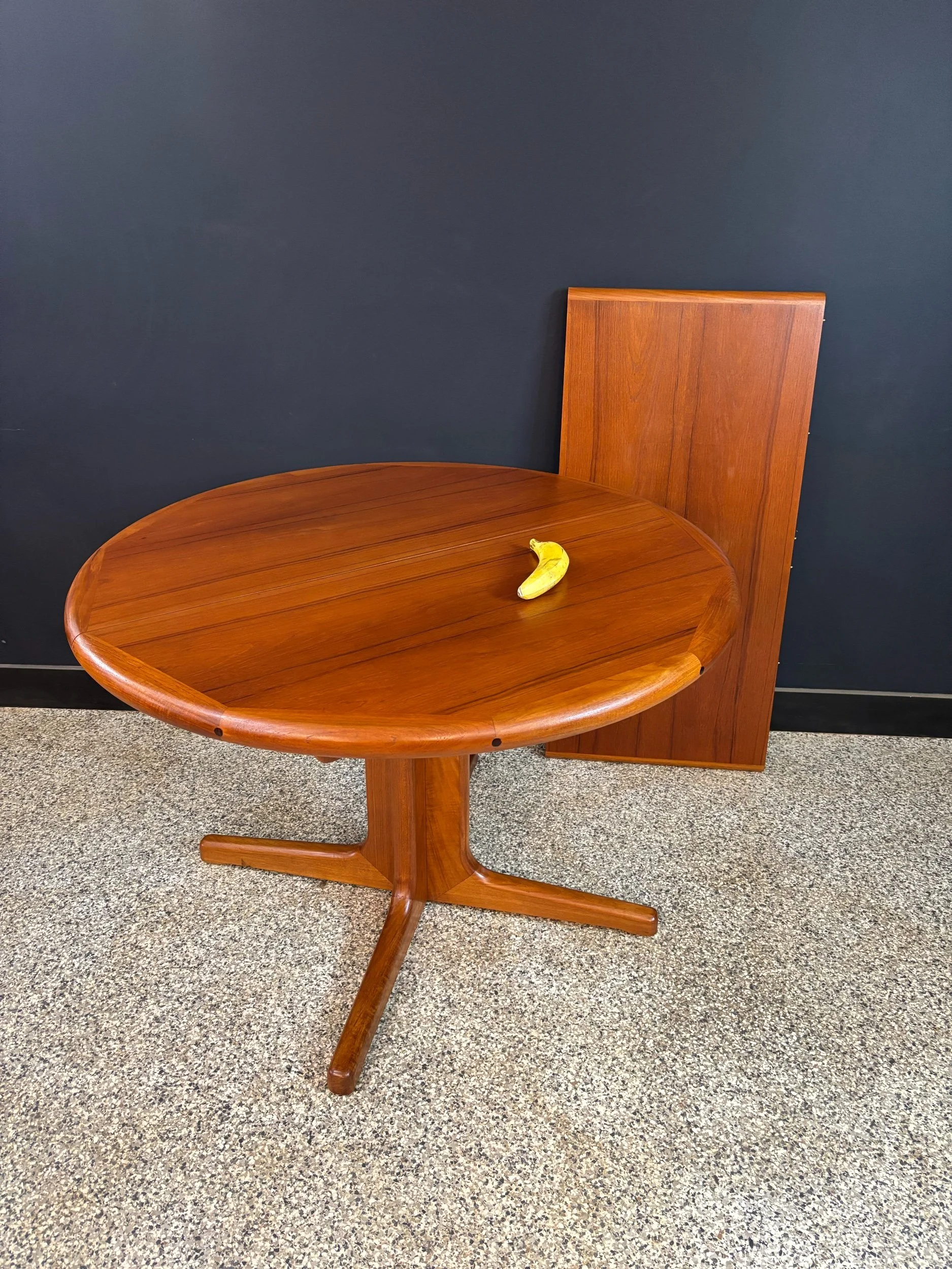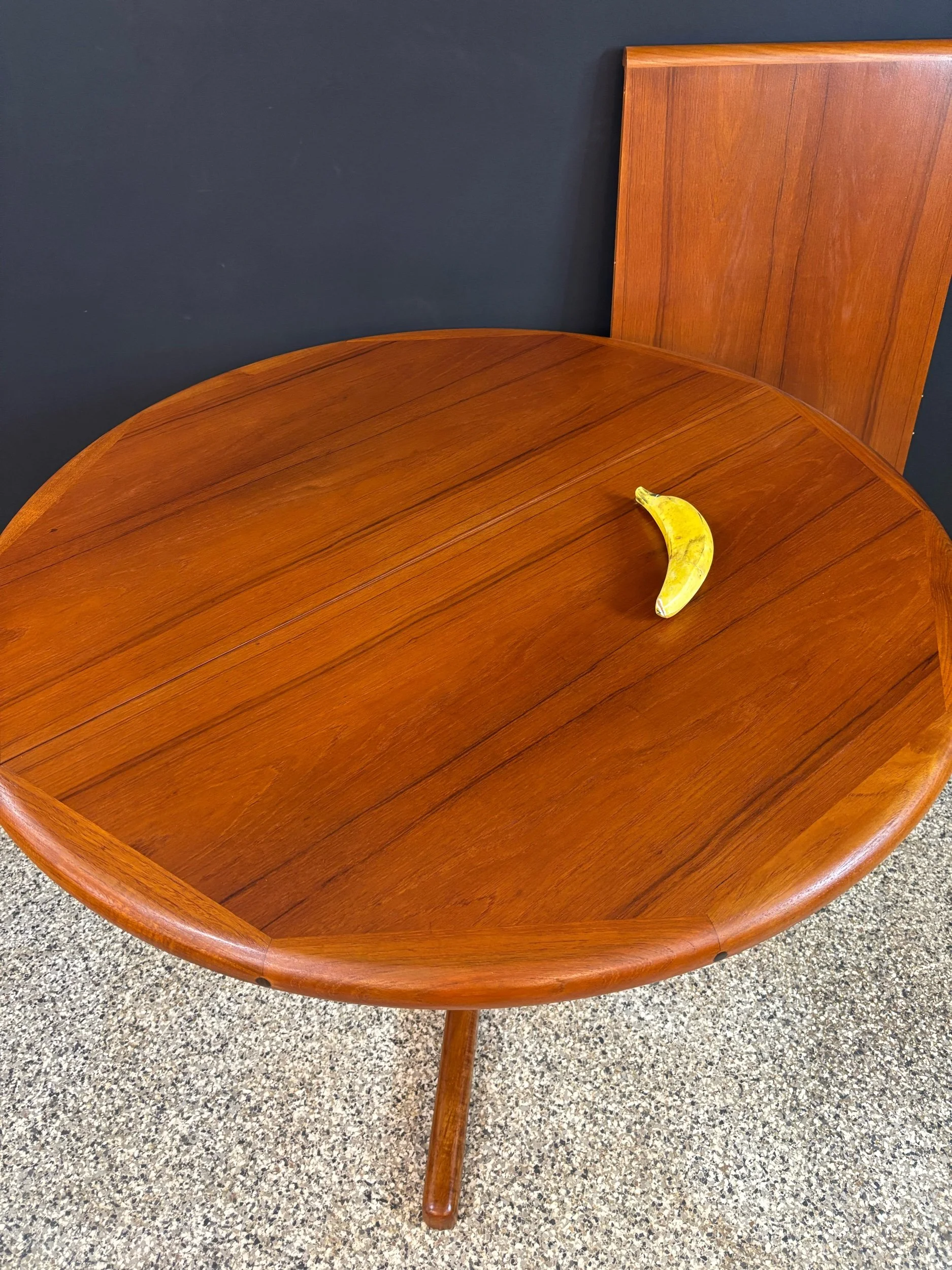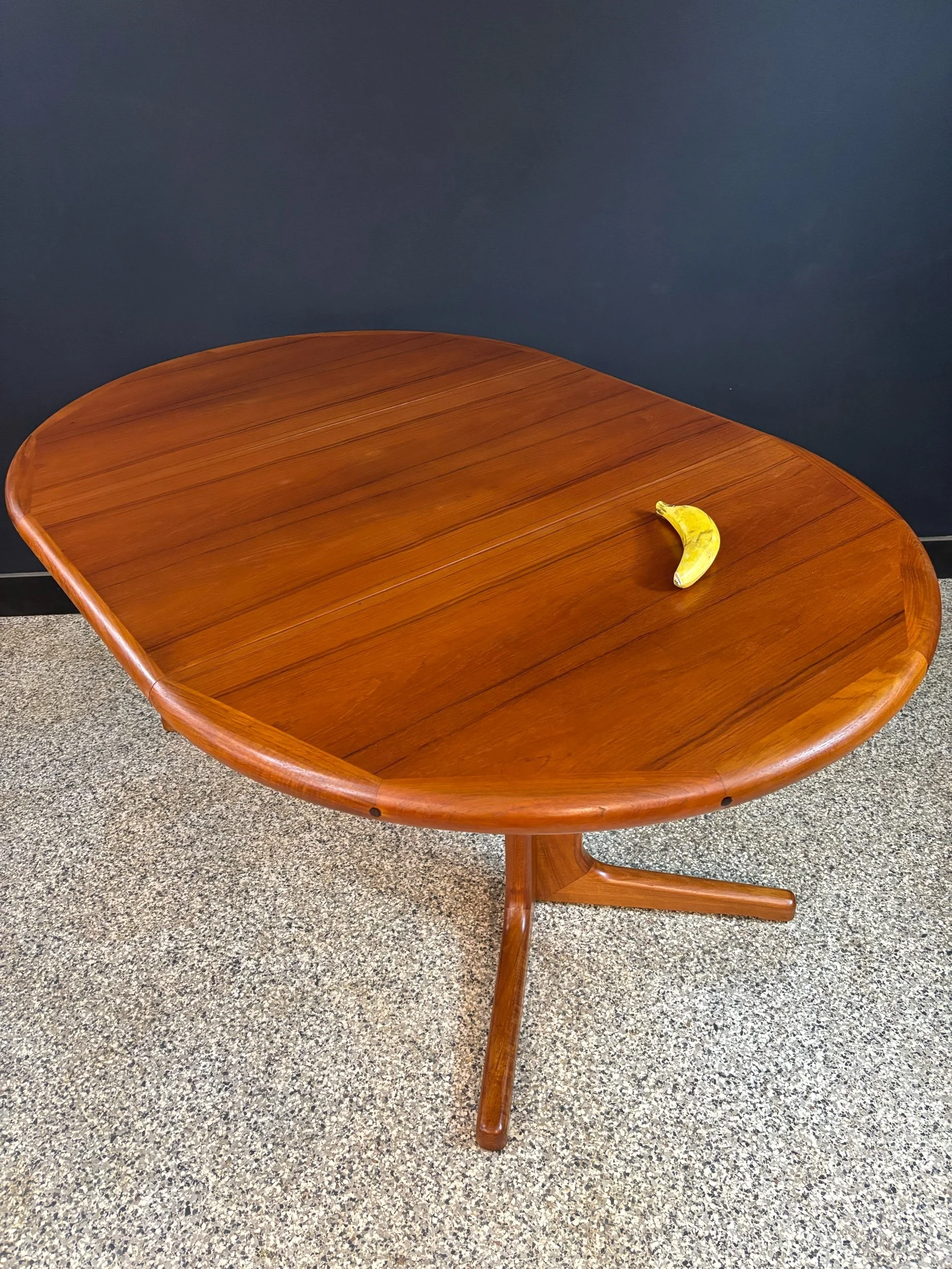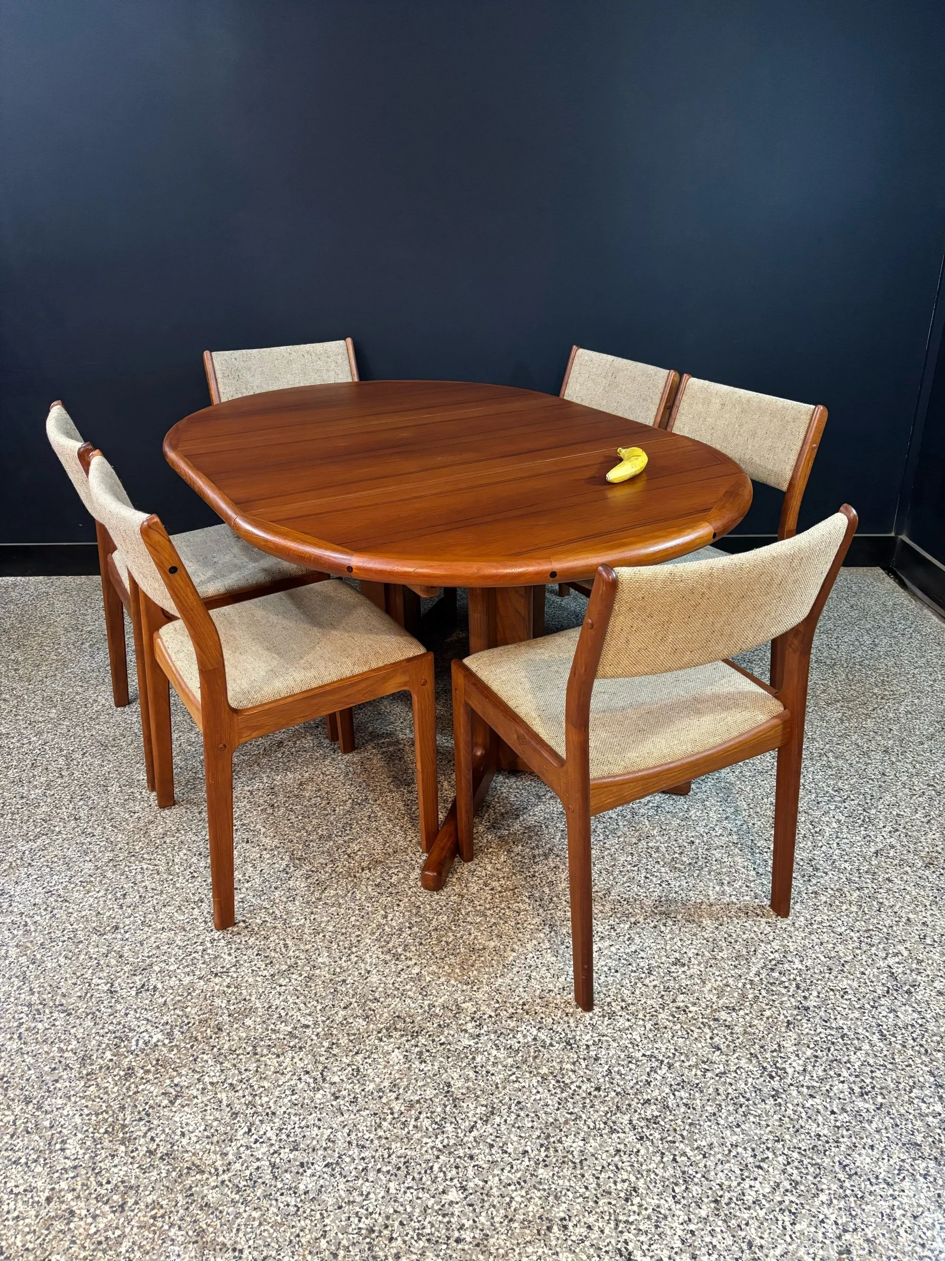 Restored vintage 1970’s Mid Century Danish Modern D-Scan teak round expanding pedestal dining table & six matching chairs.