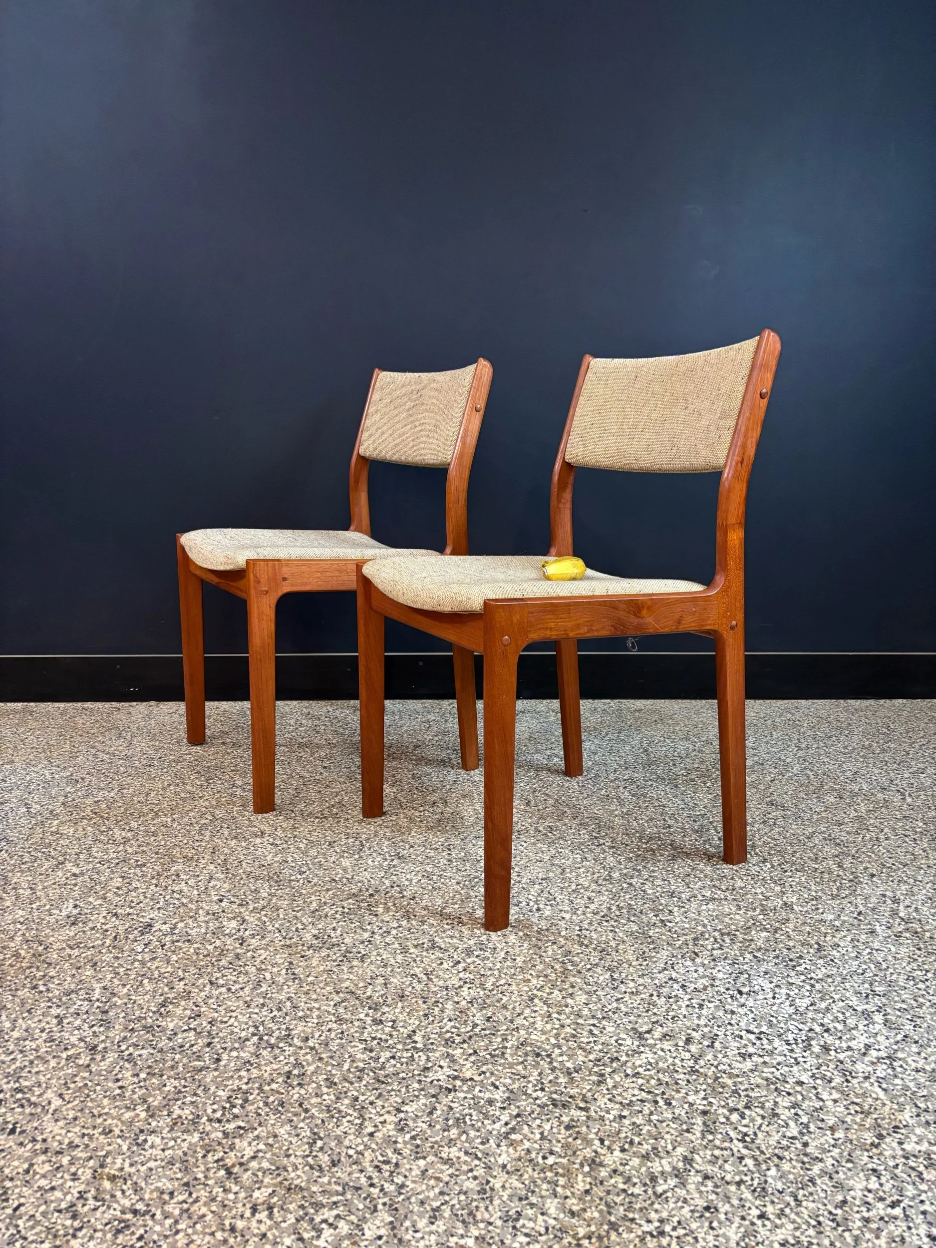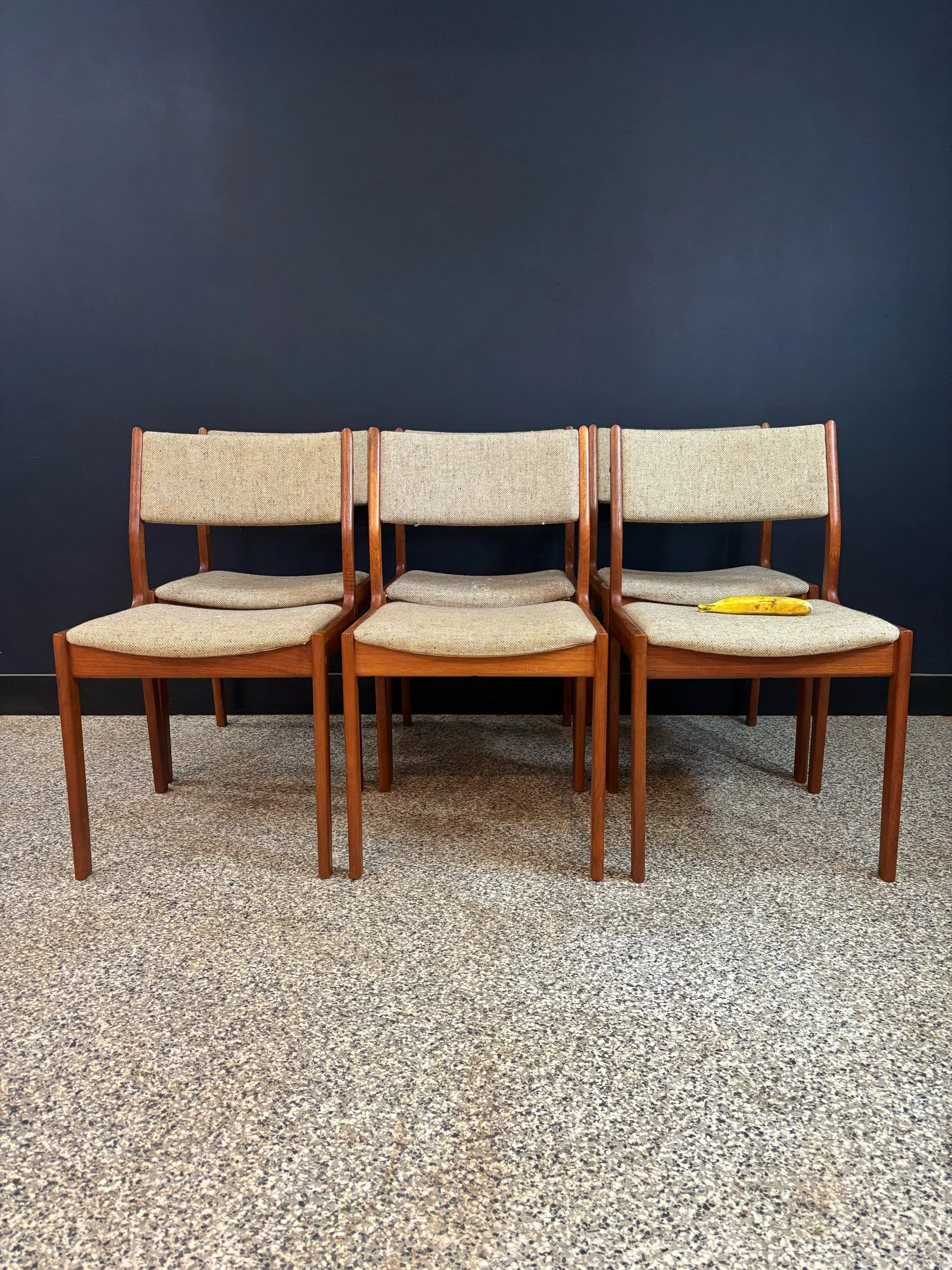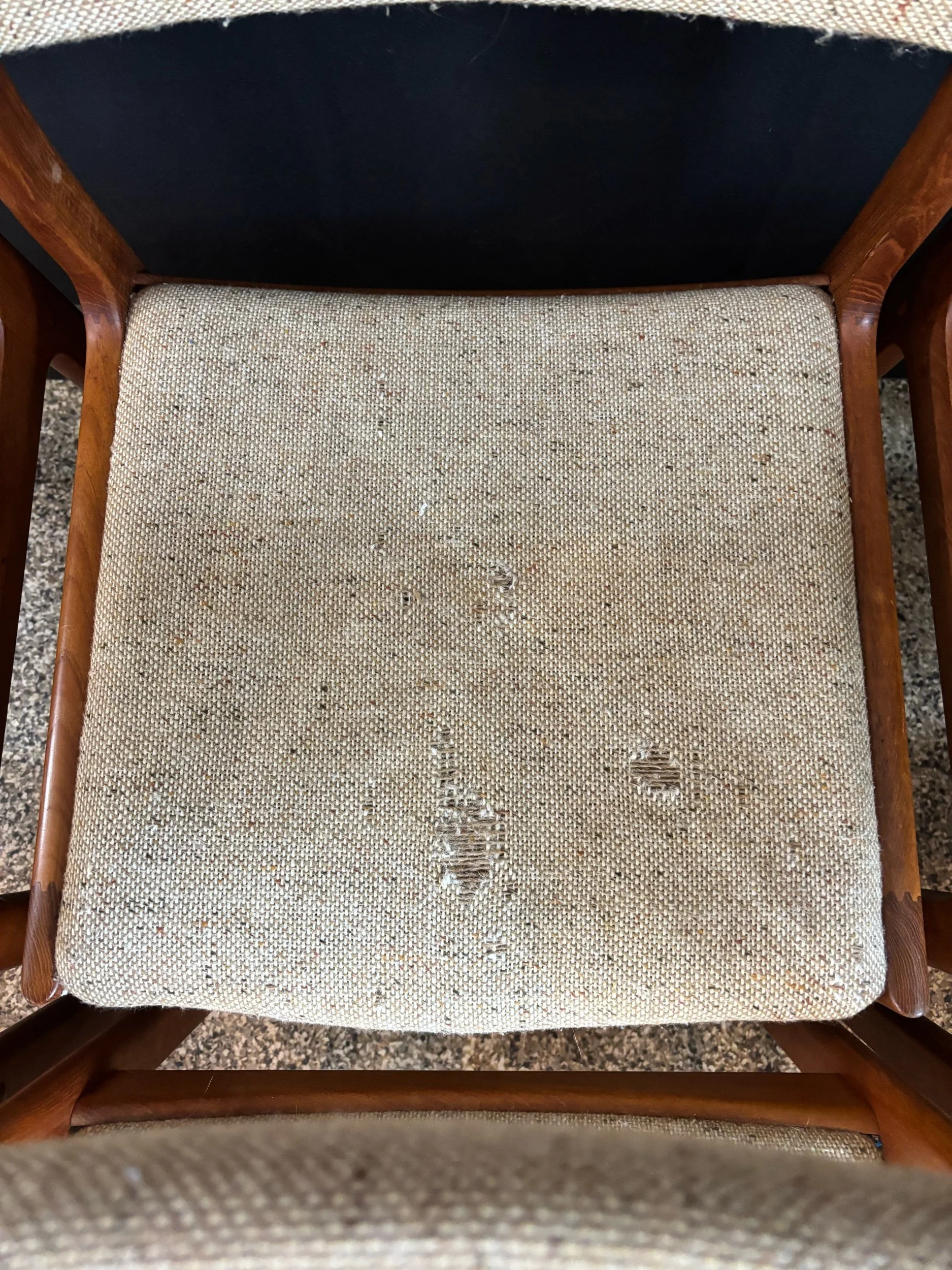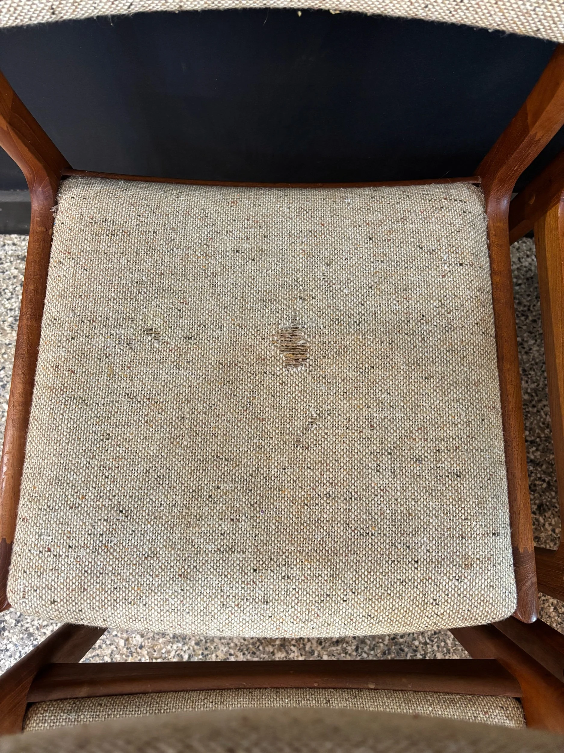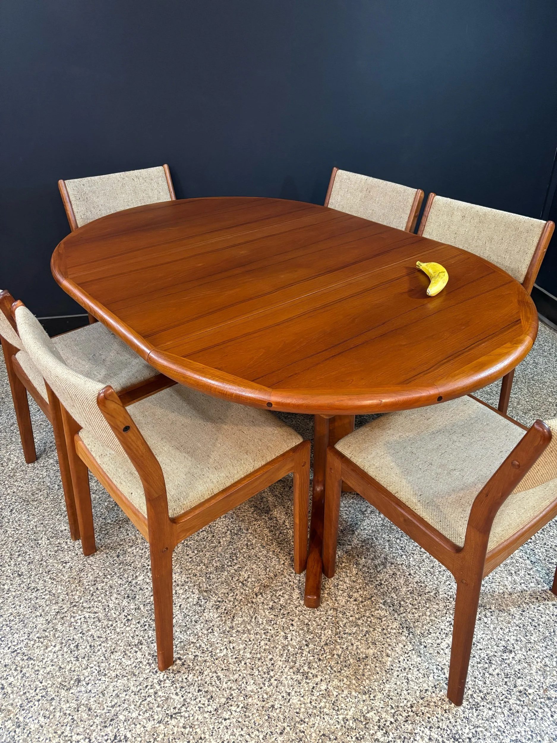 Seats a cozy six. Table has been fully restored, chairs have been cleaned up. Frames are aces, joints are tight. Two seats have wear to the upholstery. Pretty easy fix with a needle and yarn, but fibers aren’t my bag so I’m leaving that for you.