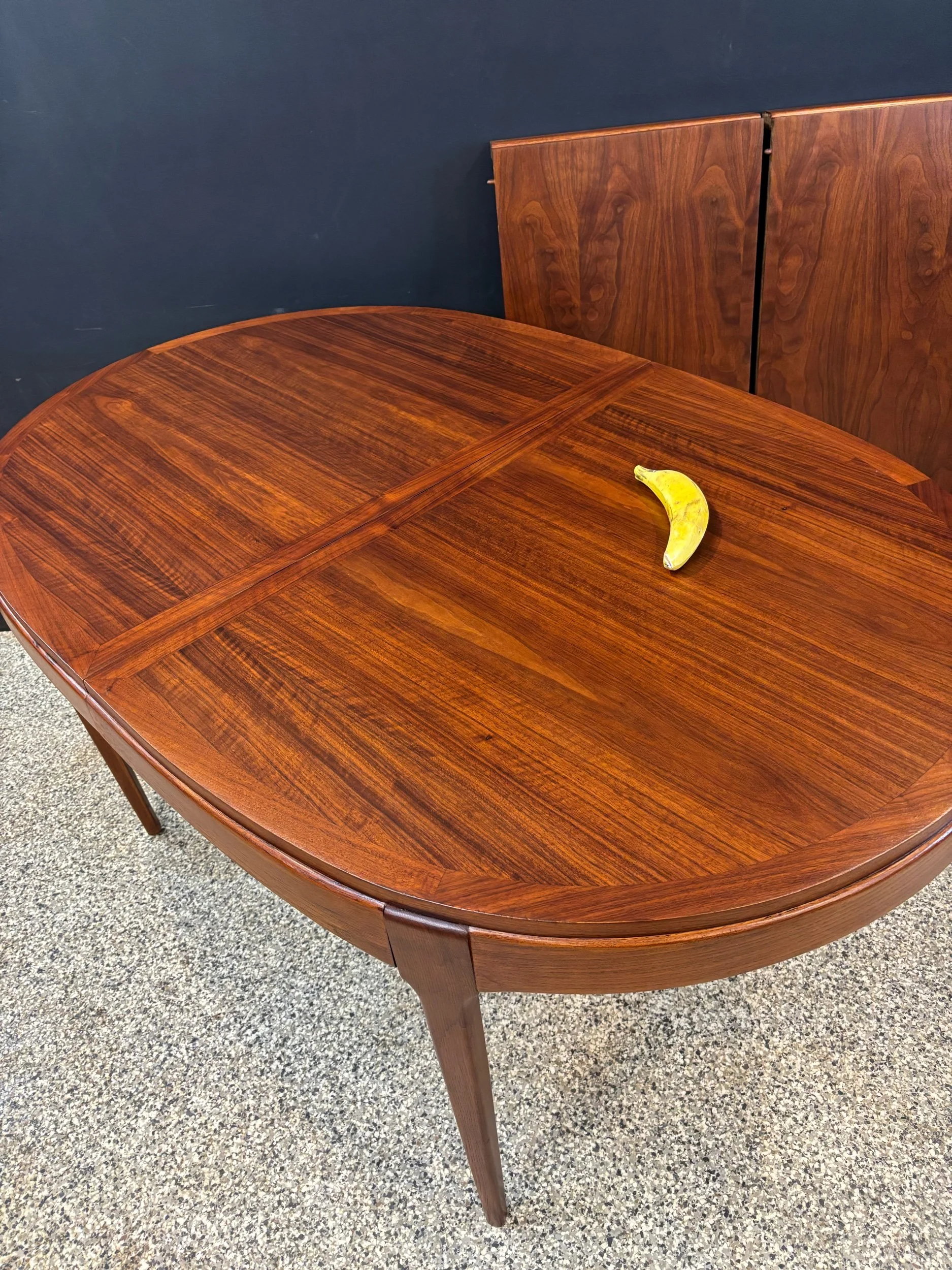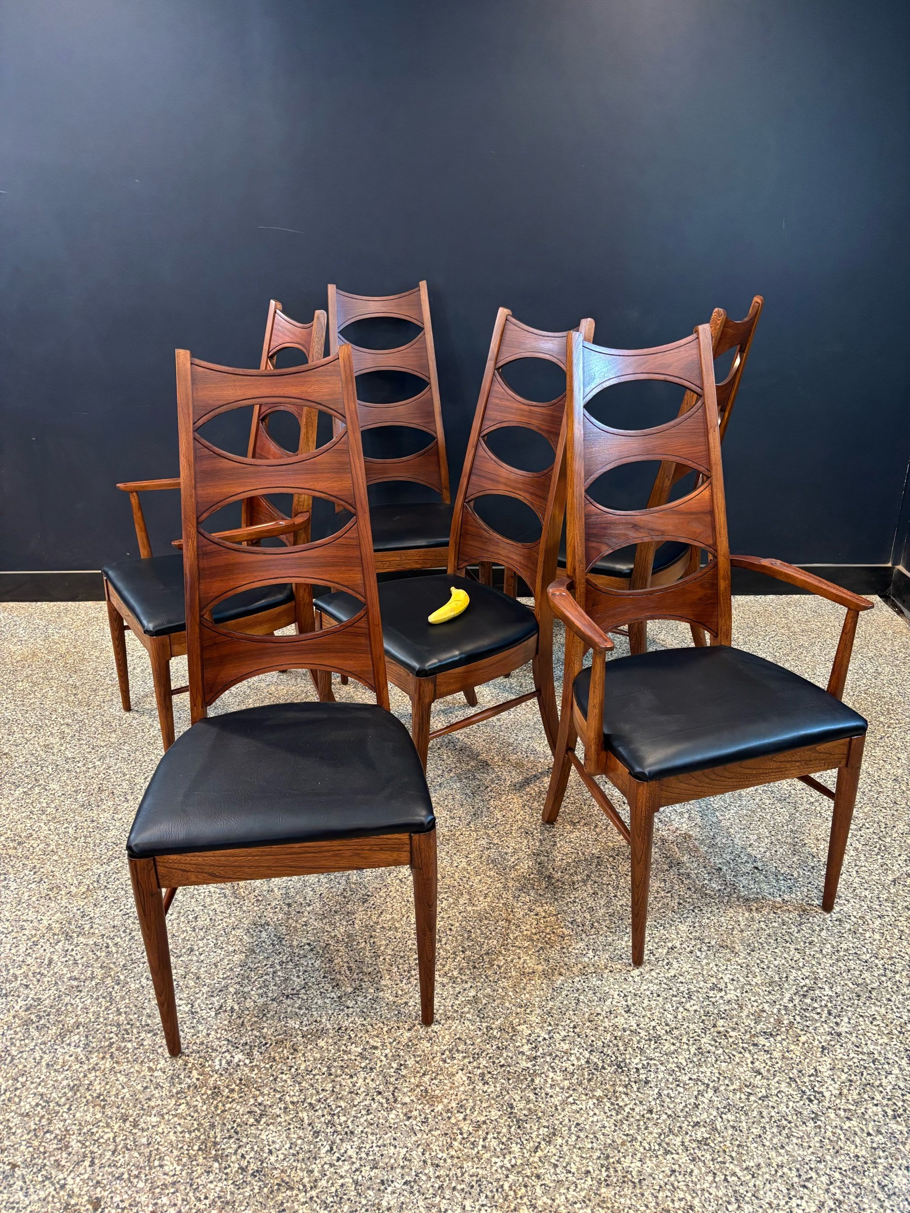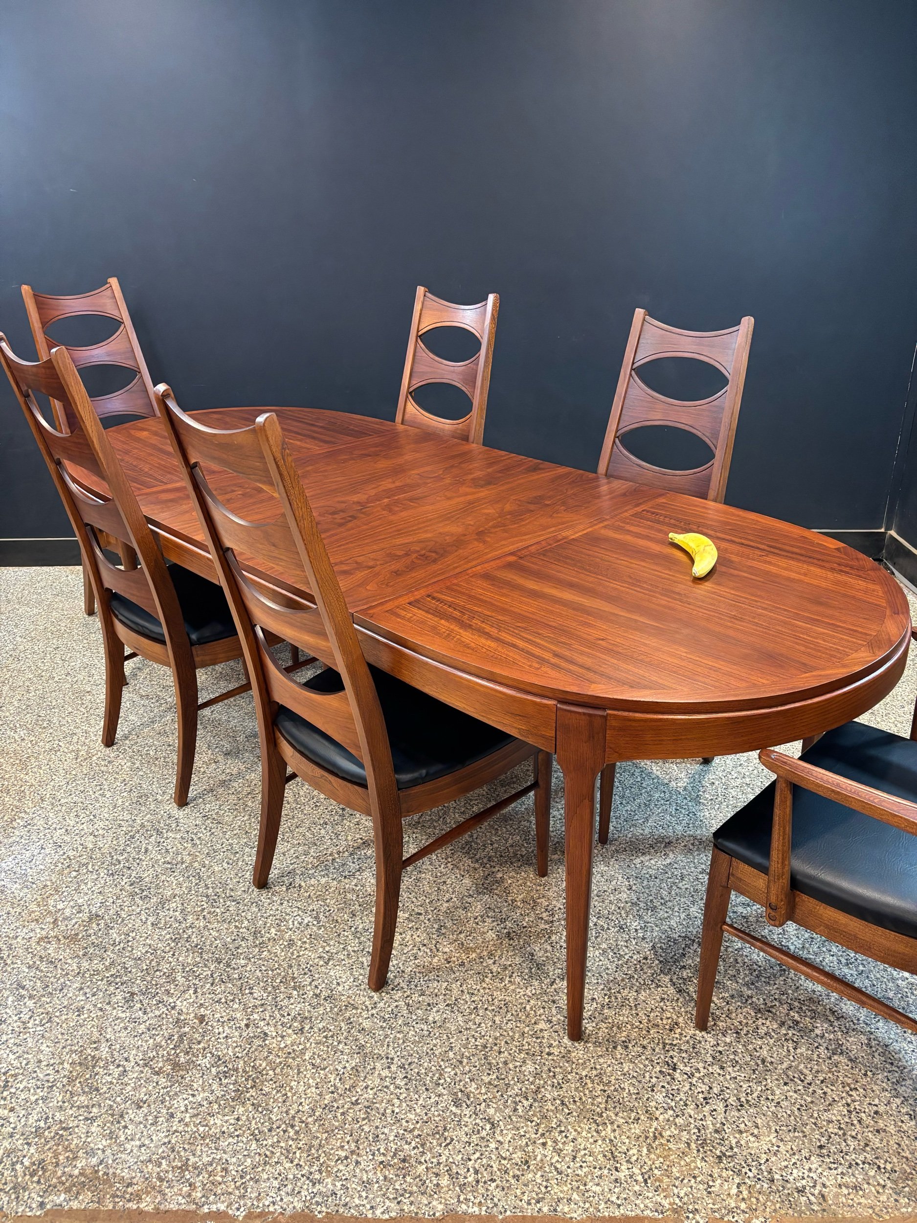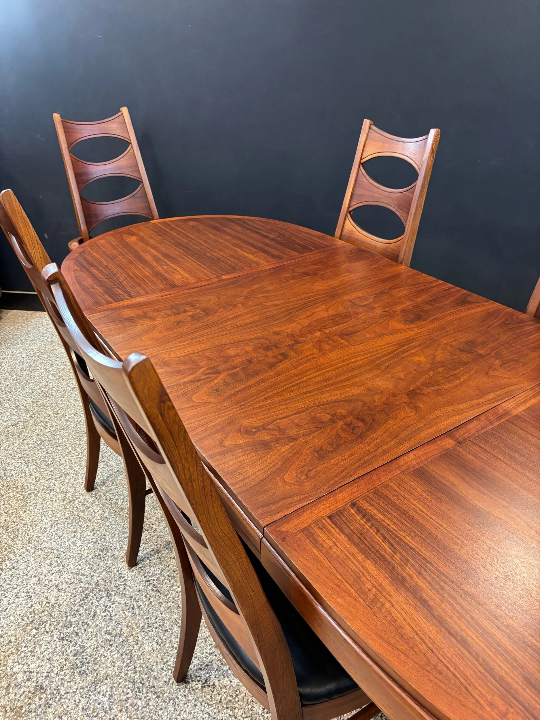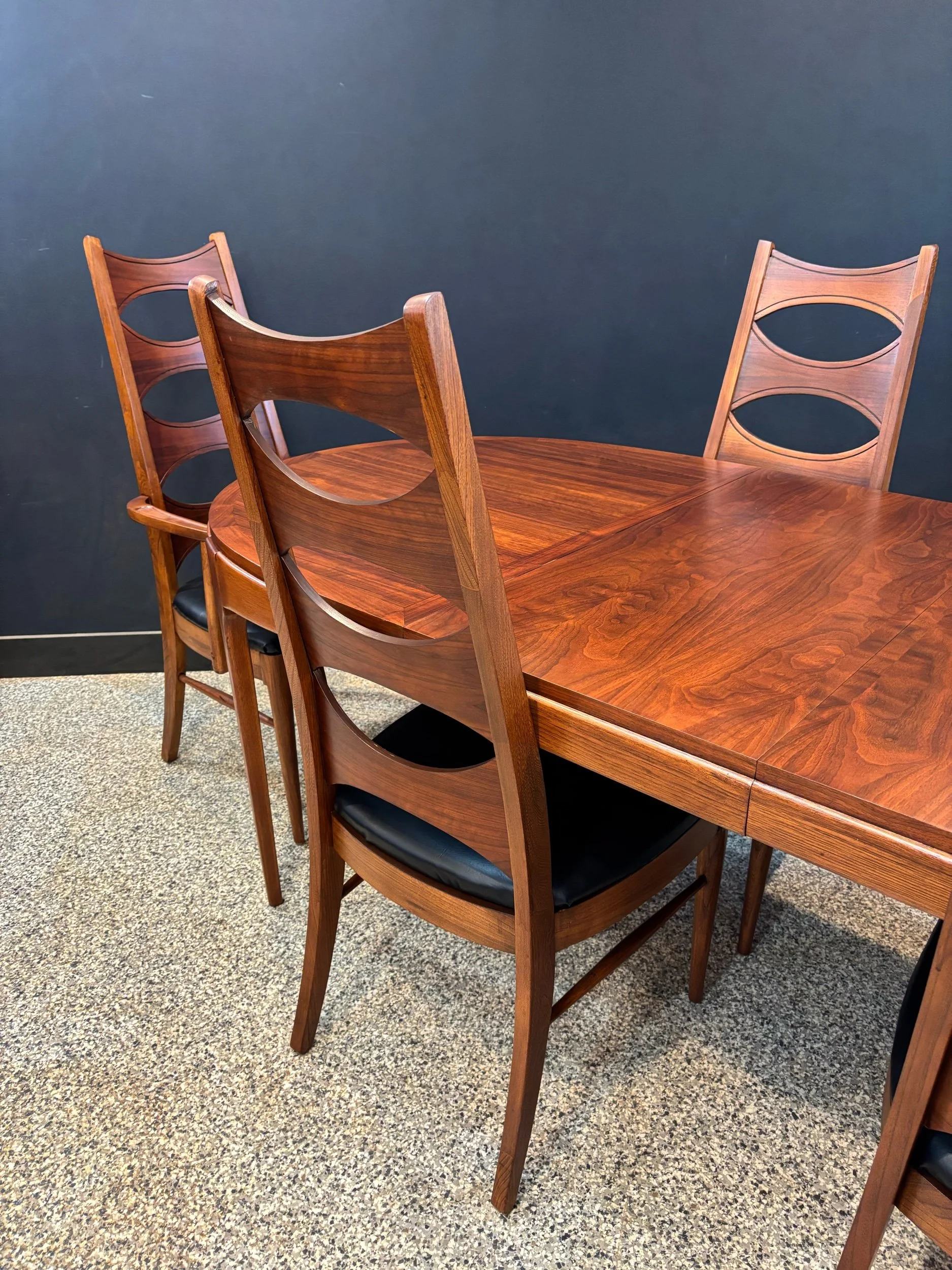 Restored vintage 1960’s Mid Century Modern Lane Rhythm walnut oval expanding dining table & six Kent Coffey Perspecta walnut high back cat eye dining chairs.