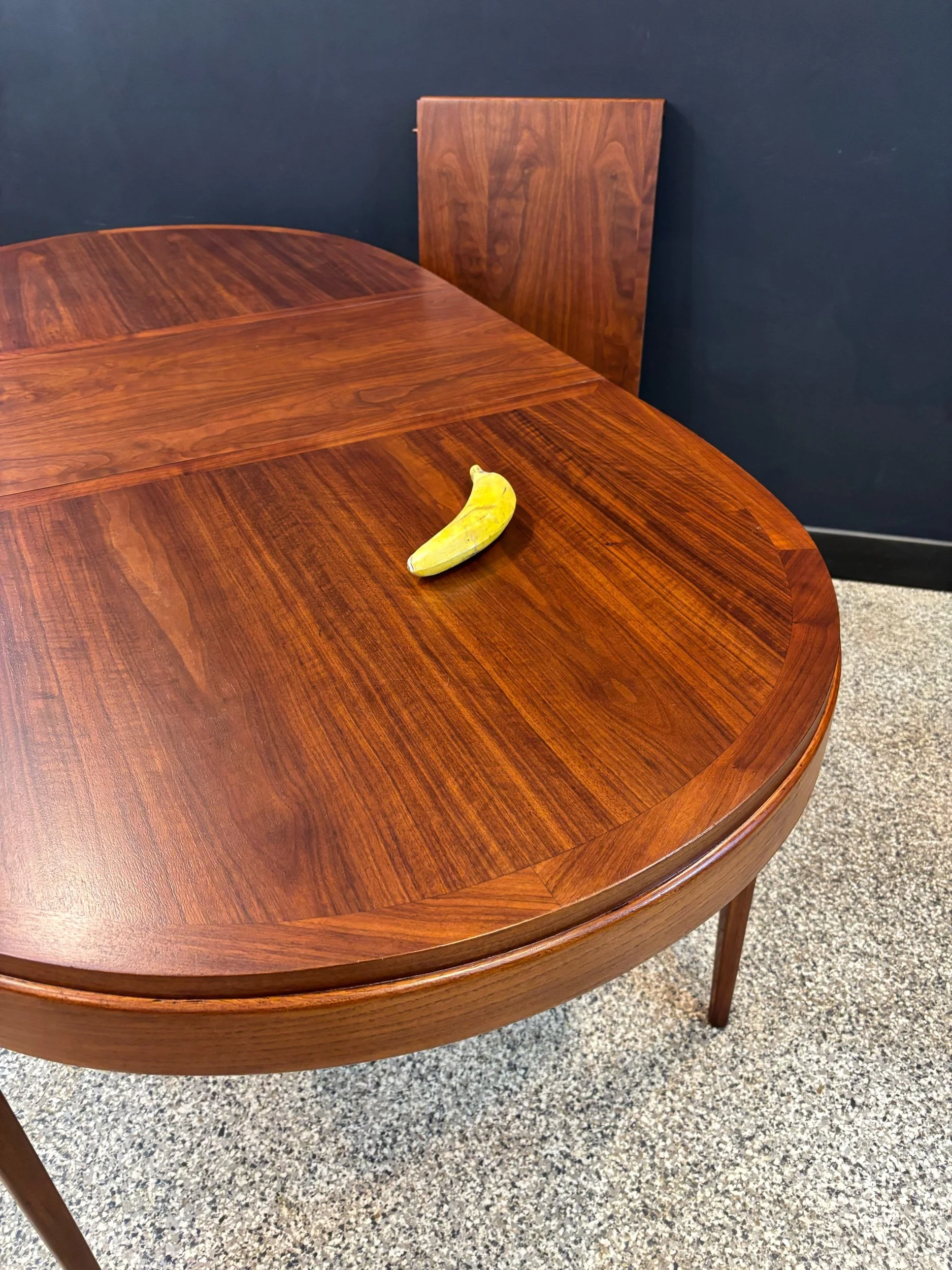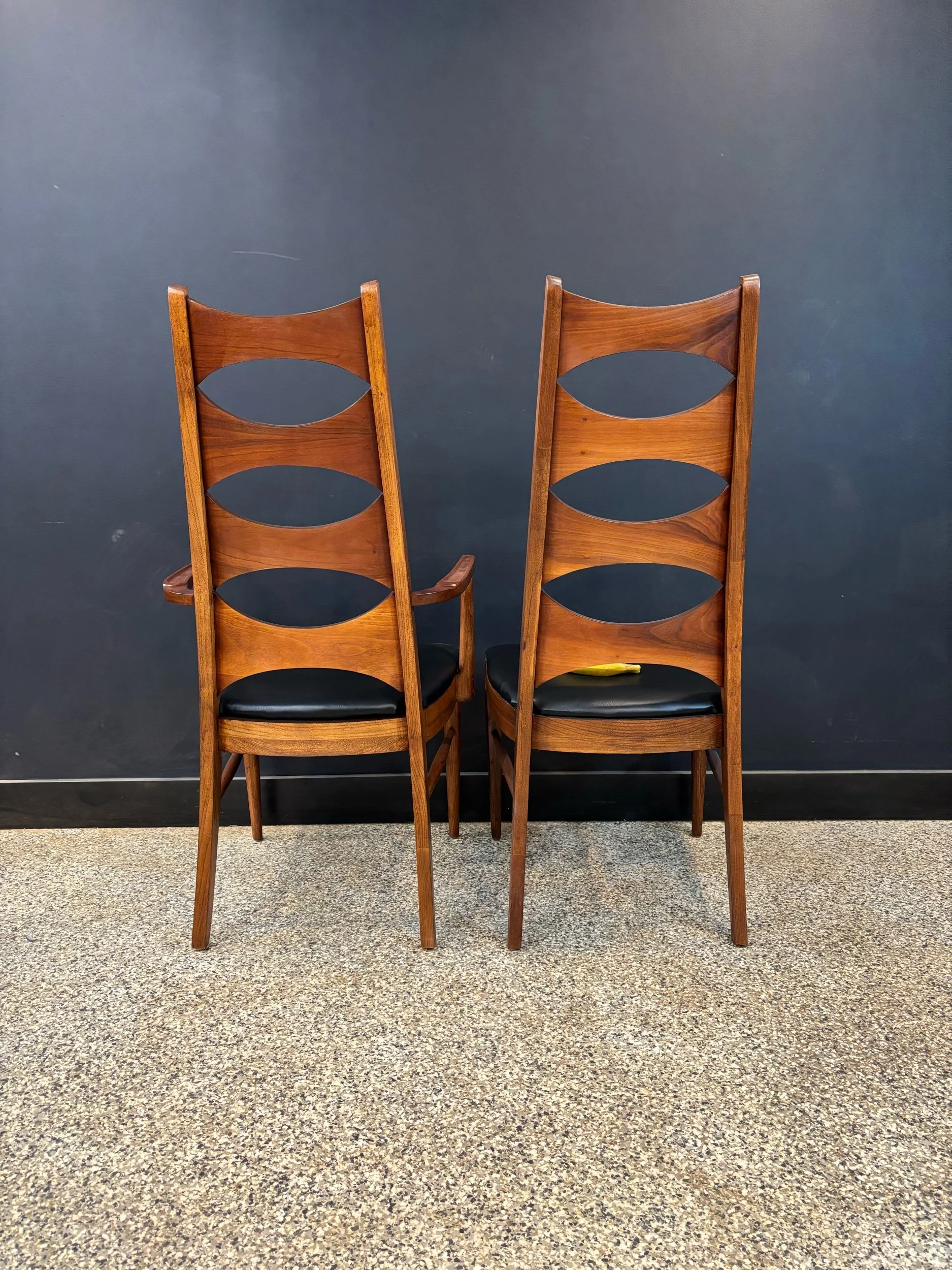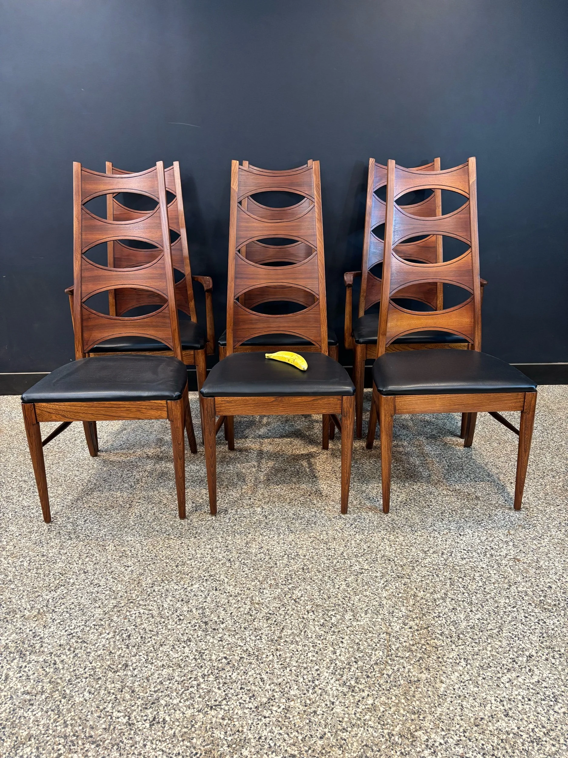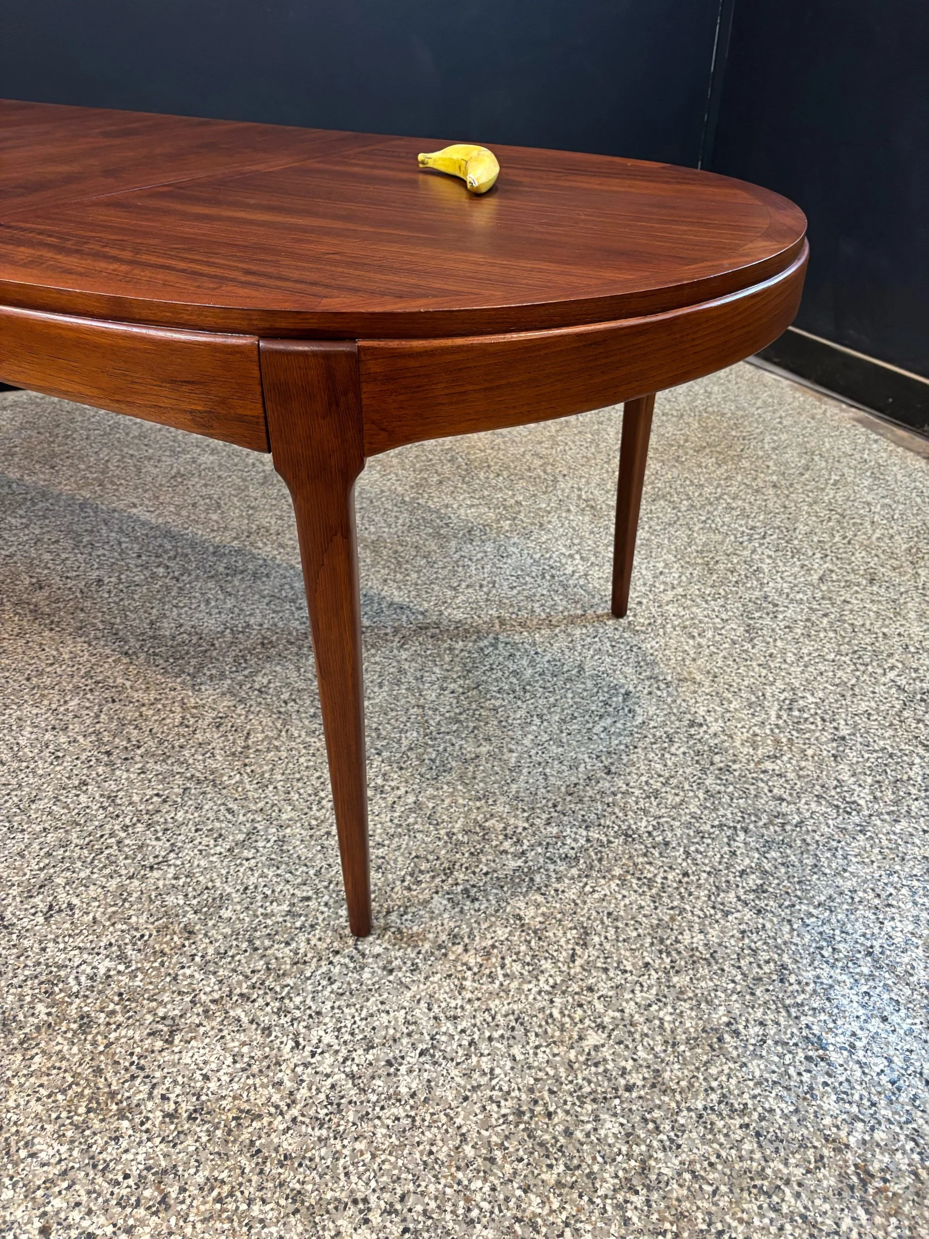 Restored vintage 1960’s Mid Century Modern Lane Rhythm walnut oval expanding dining table & six Kent Coffey Perspecta walnut high back cat eye dining chairs.