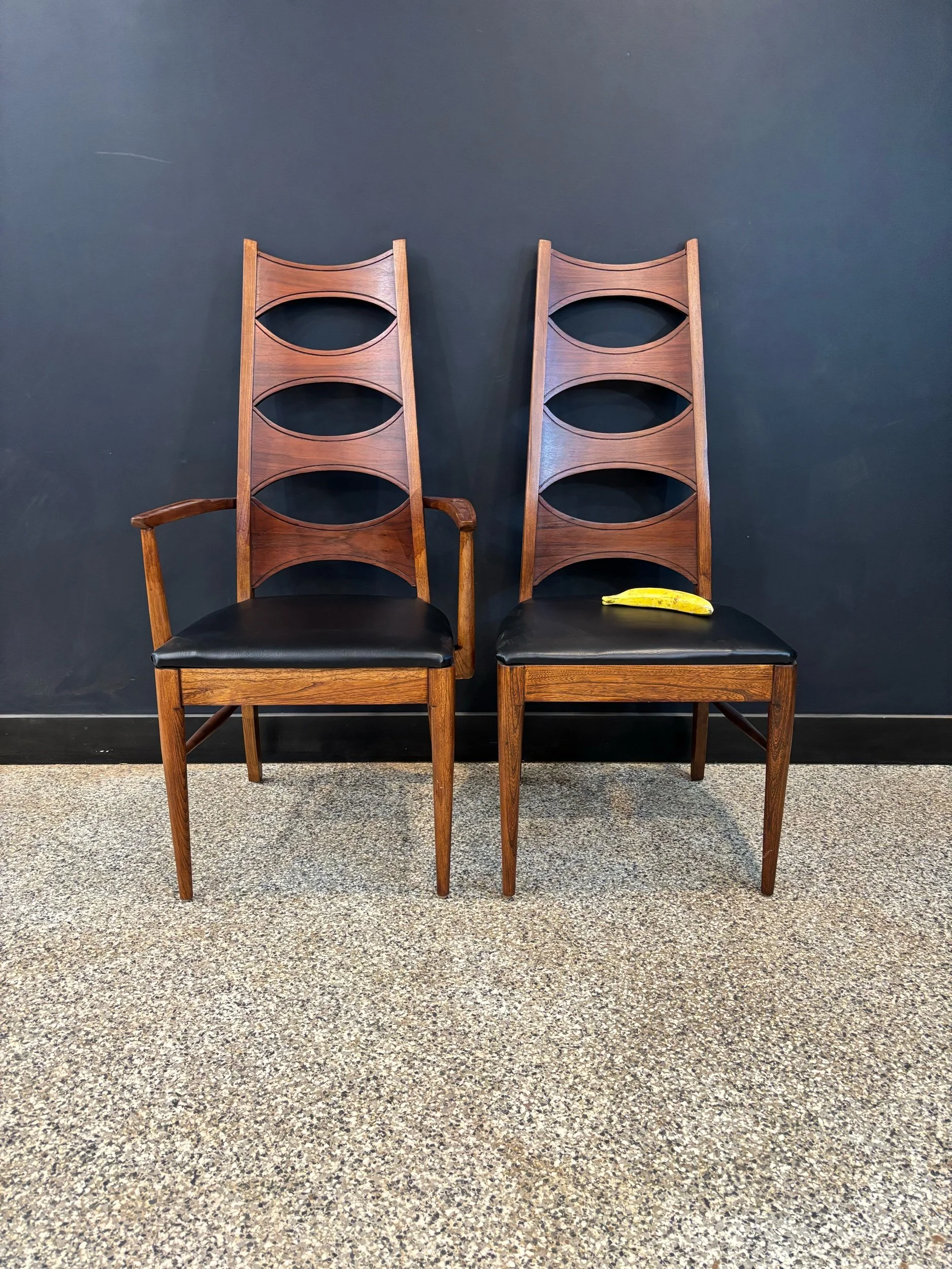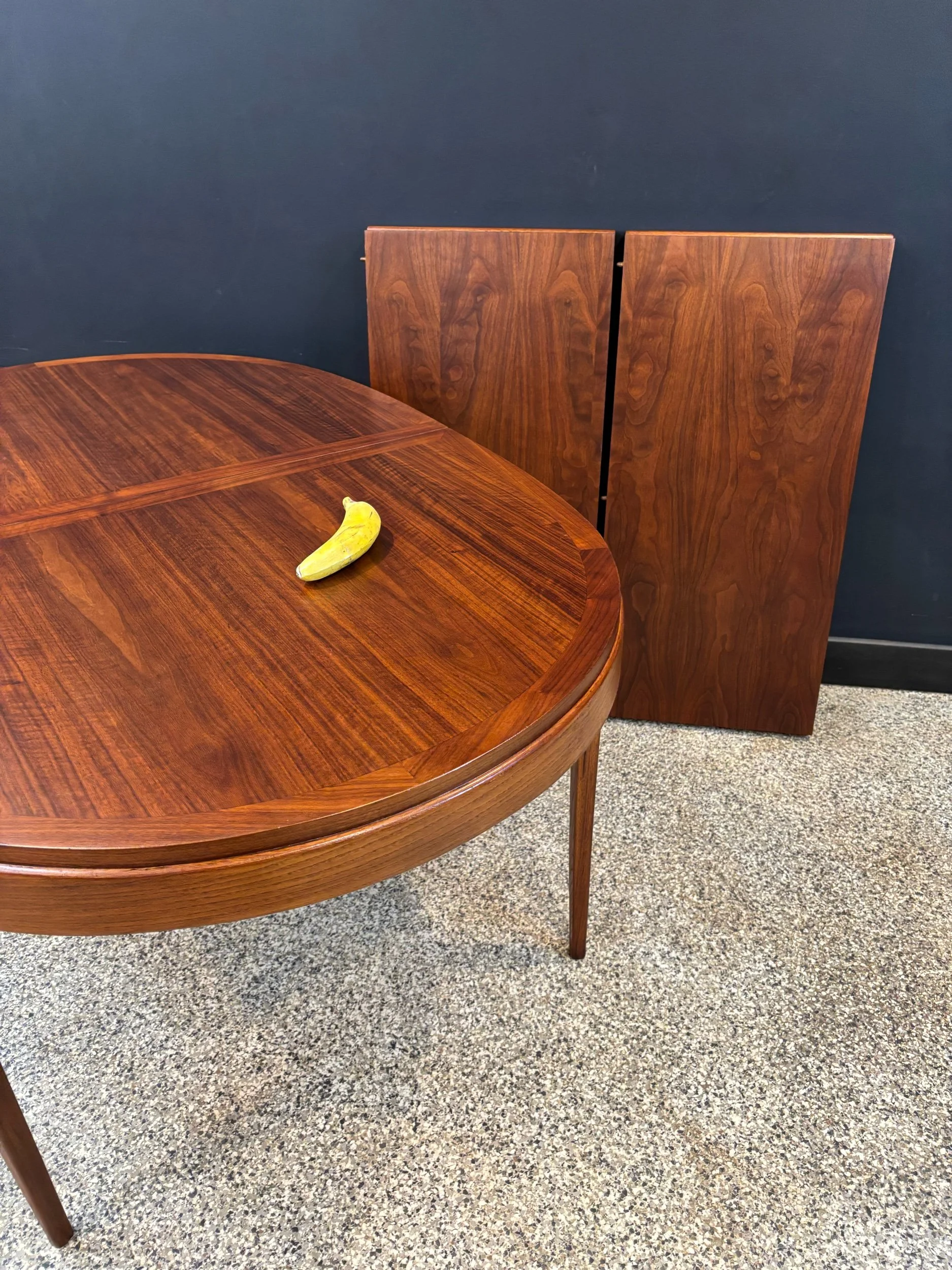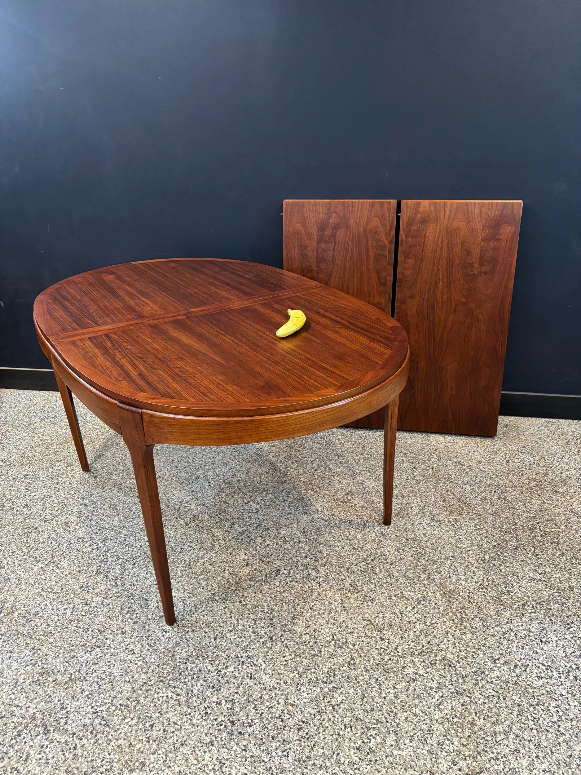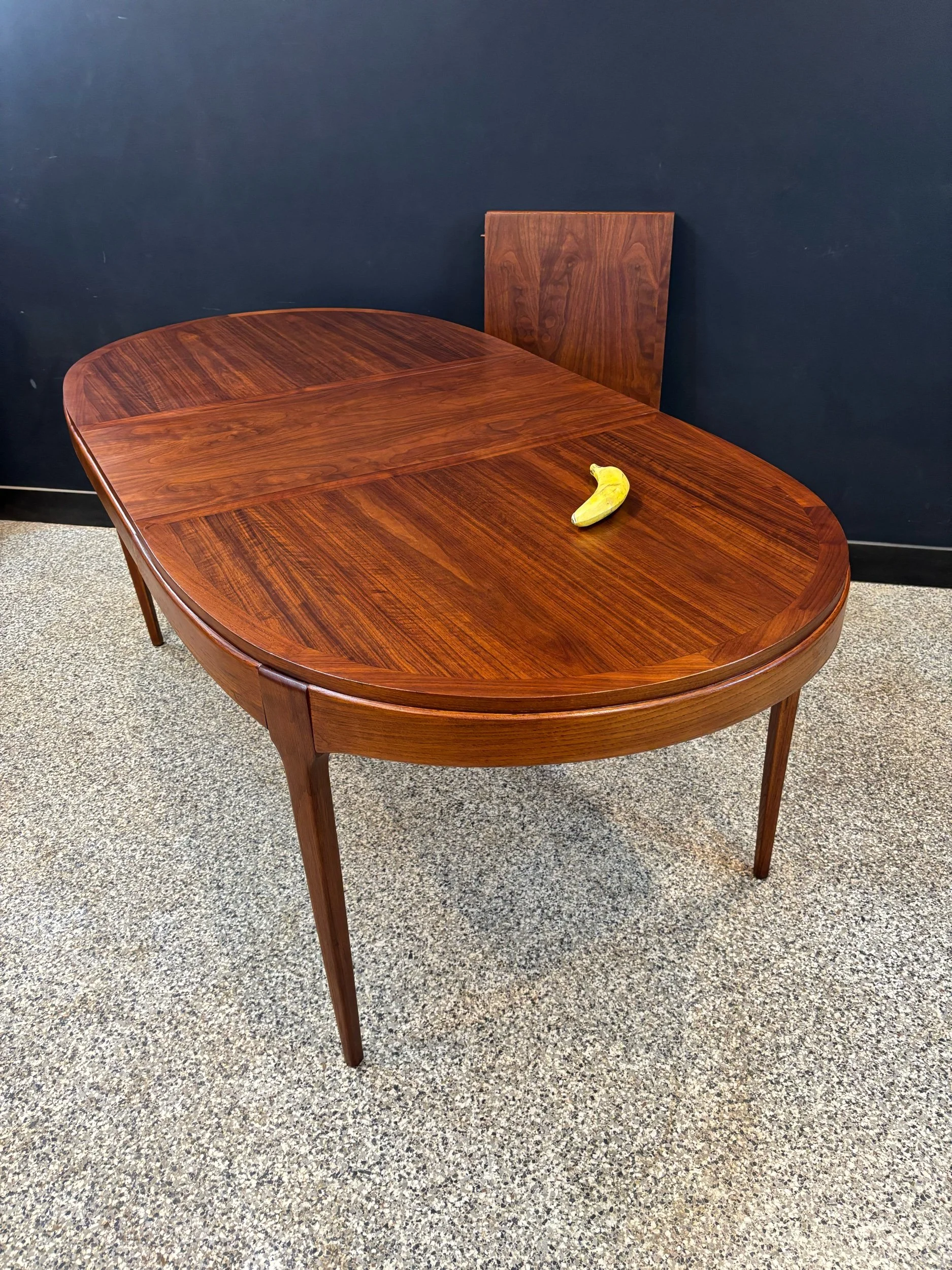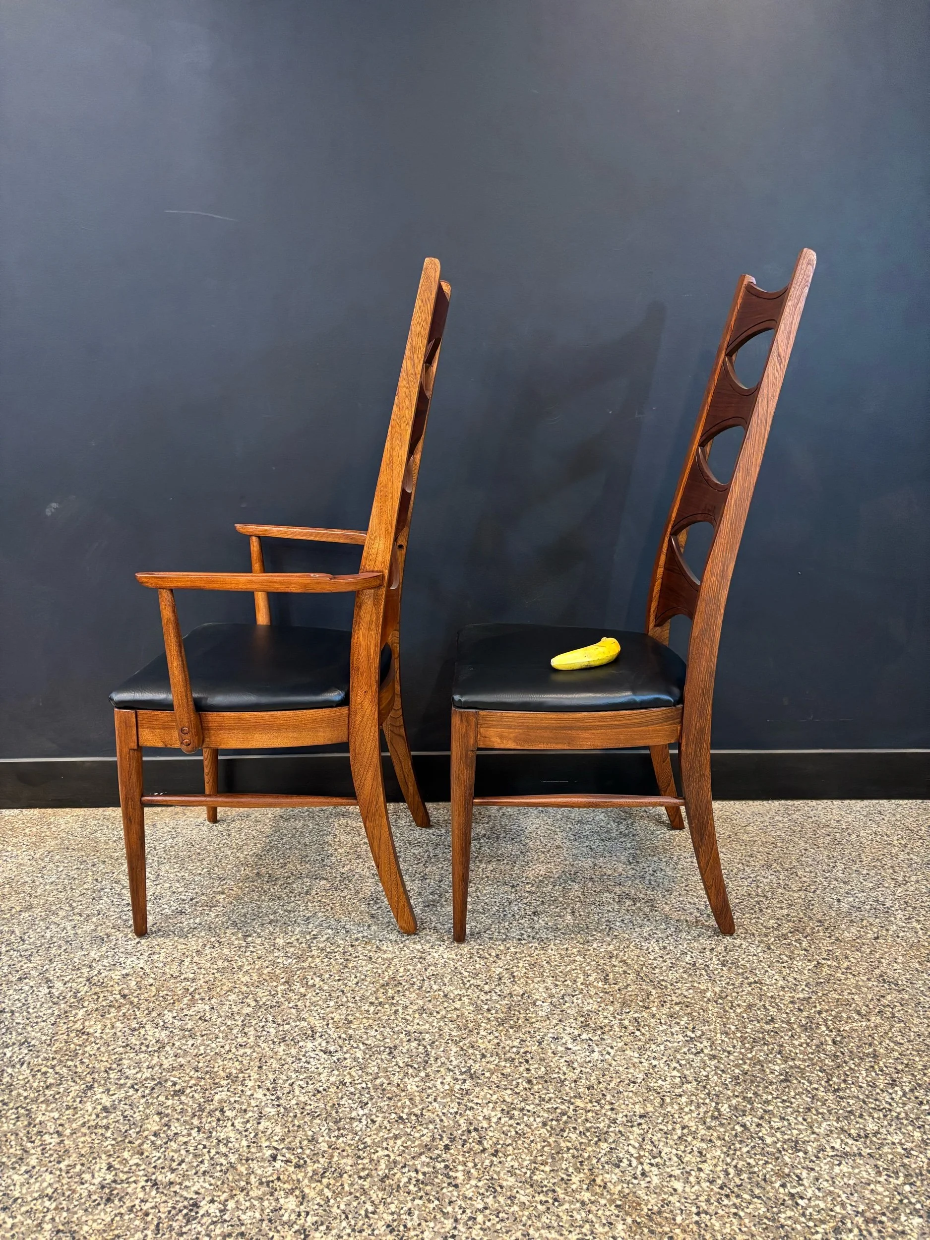 Restored vintage 1960’s Mid Century Modern Lane Rhythm walnut oval expanding dining table & six Kent Coffey Perspecta walnut high back cat eye dining chairs.