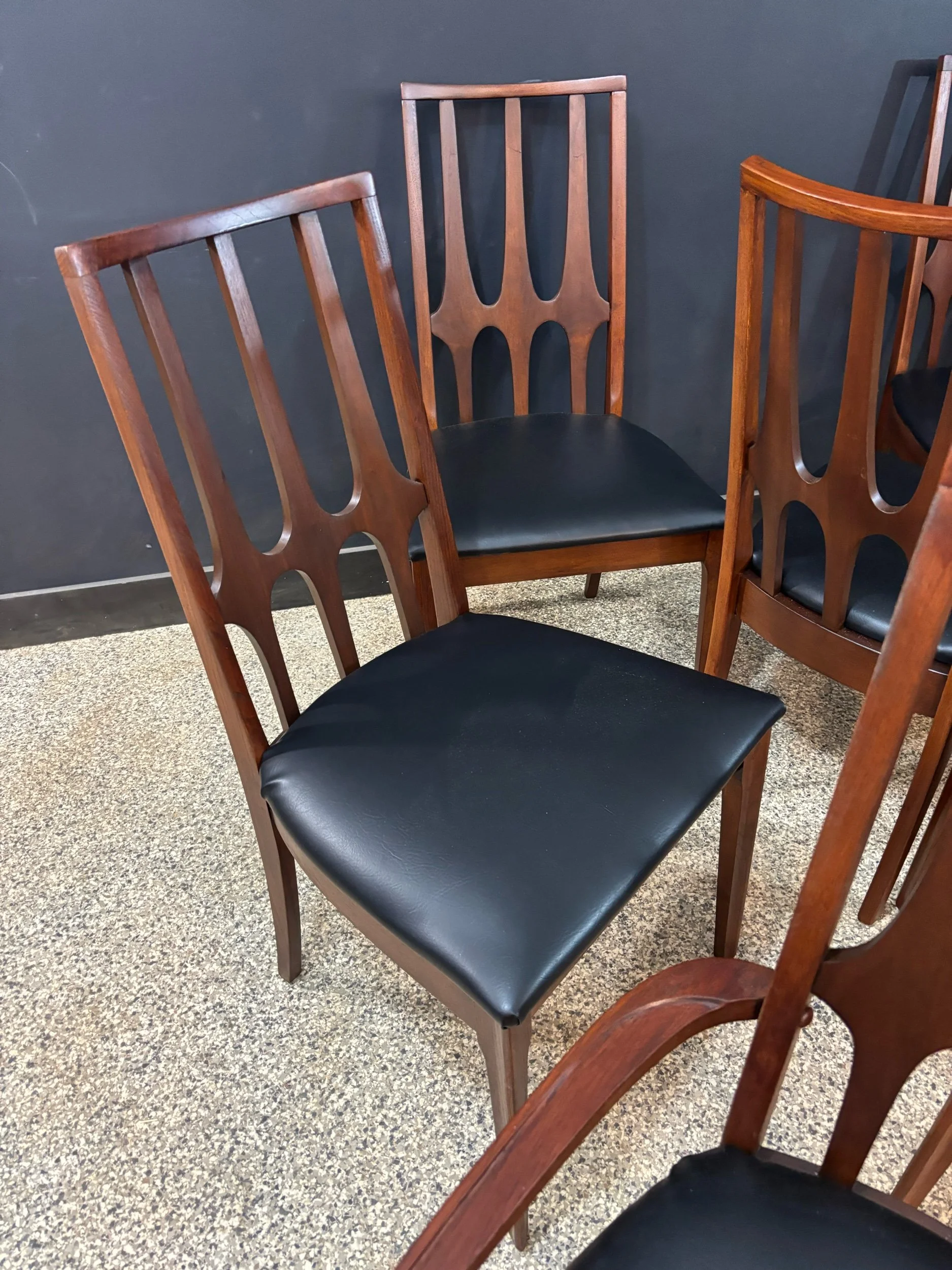 Chair joints are tight and seats have been recovered in black vinyl. Everything has been fully restored. What a scene this set is. 👀
